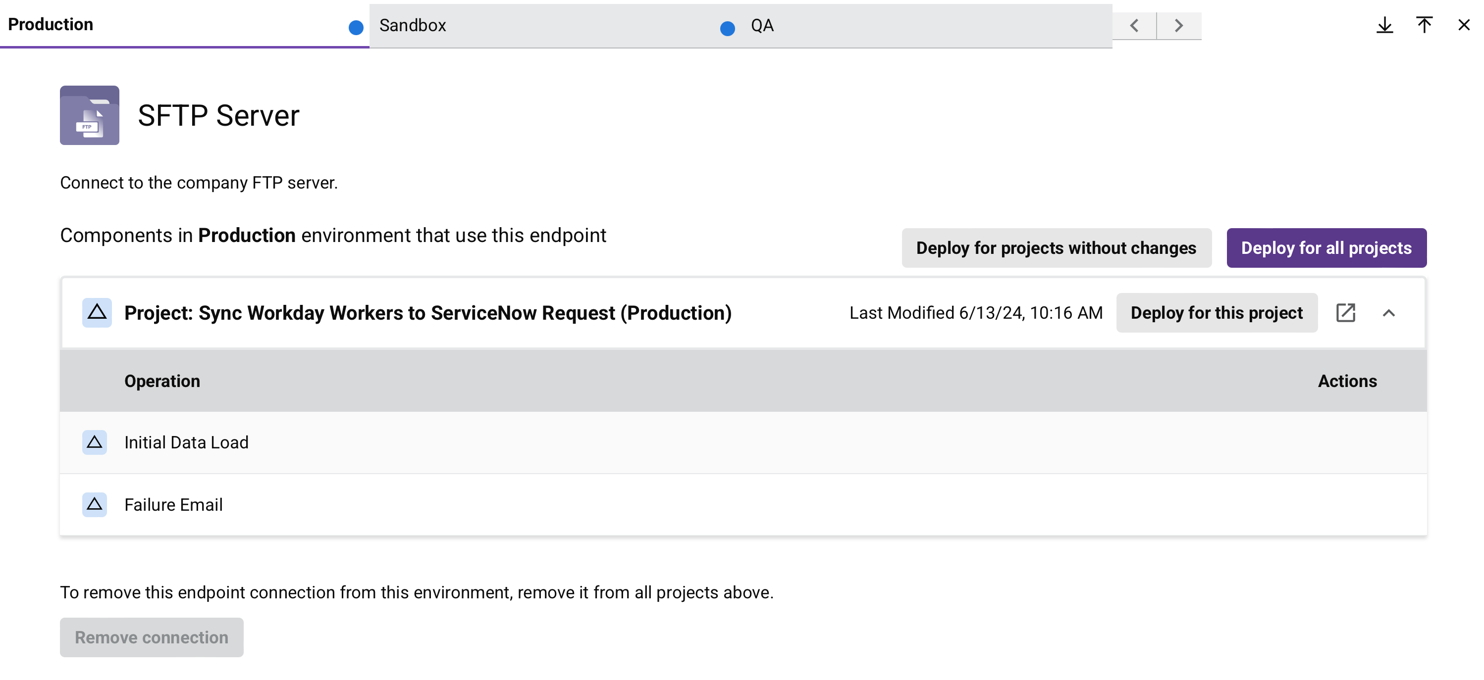 Deploy for projects without changes: Click to deploy operations dependent on the global endpoint for projects in this environment where the only changes to deploy are those to the global endpoint (excludes projects that have any operations with the undeployed changes icon). After deploy, the next time these projects' operations run, they will use the latest global endpoint configuration.