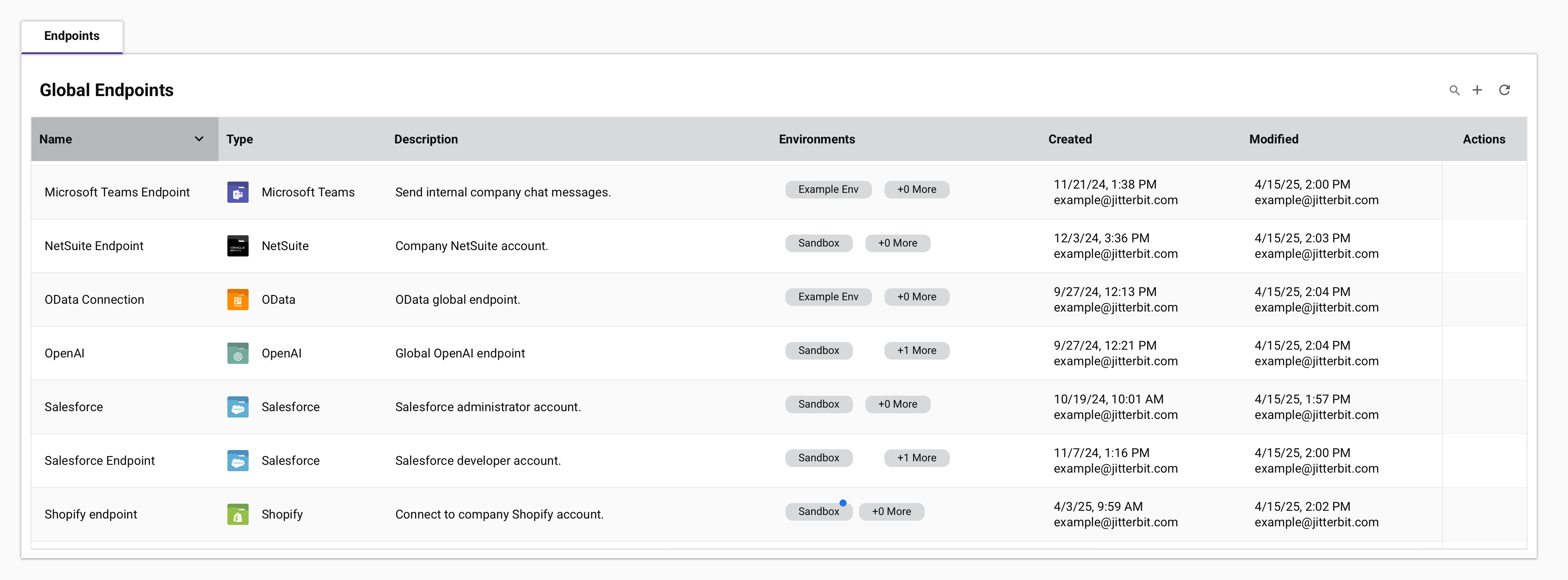 From the Global Endpoints page, you can view, create, edit, and delete global endpoints depending on the environment access levels granted to your role. Once a global endpoint is added to an environment, it becomes visible to users in the design component palette to use in a project.