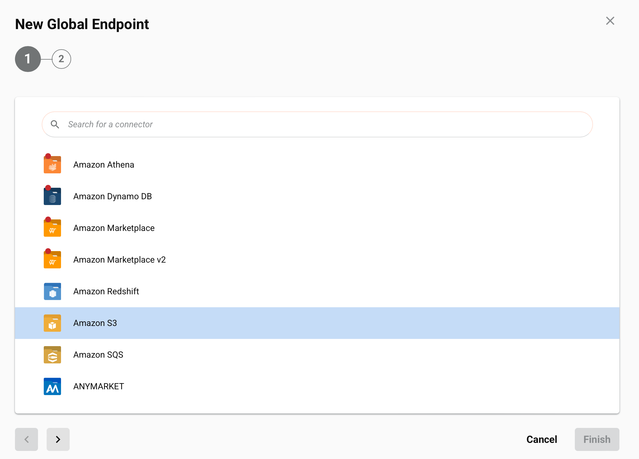 Connectors: Click to select a connector from which to create a new global endpoint. All connectors in the organization except for the API, SOAP, and Variable connectors are listed, including custom connectors. Connectors that can be used only in environments associated with a private agent group are indicated with a red dot
